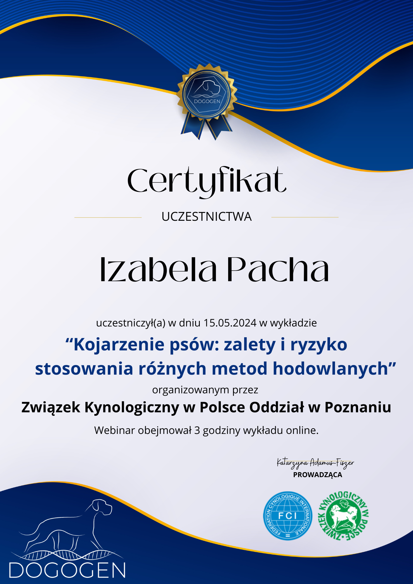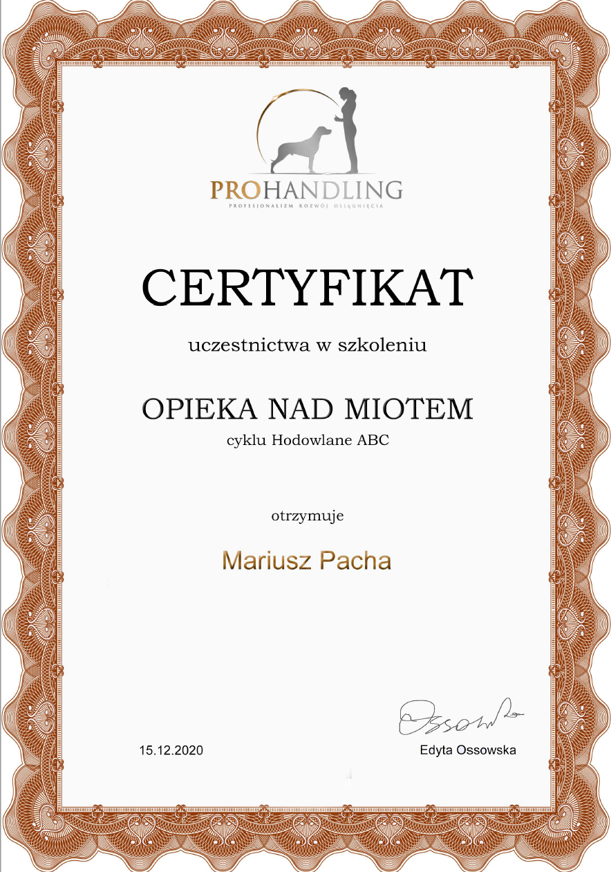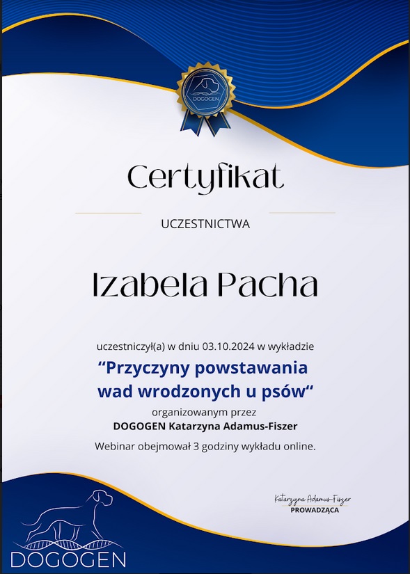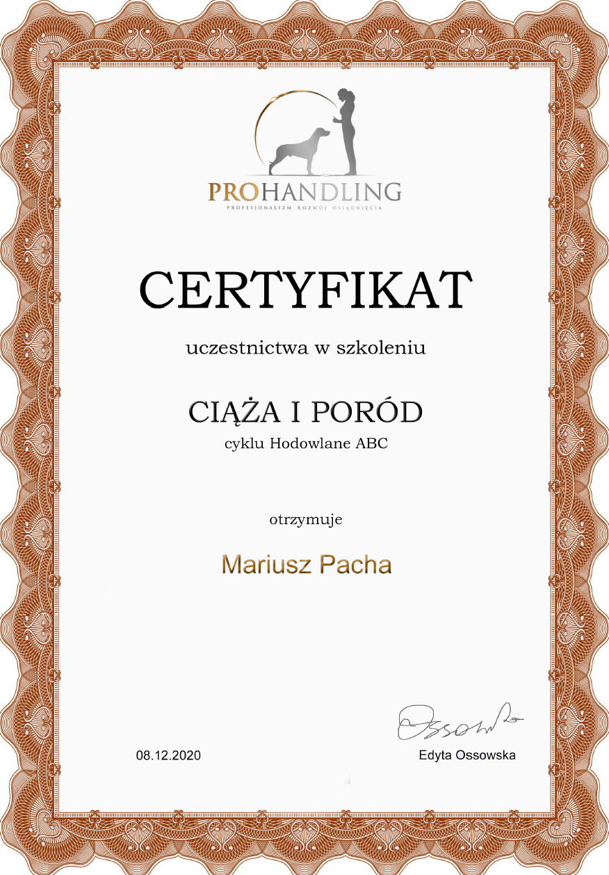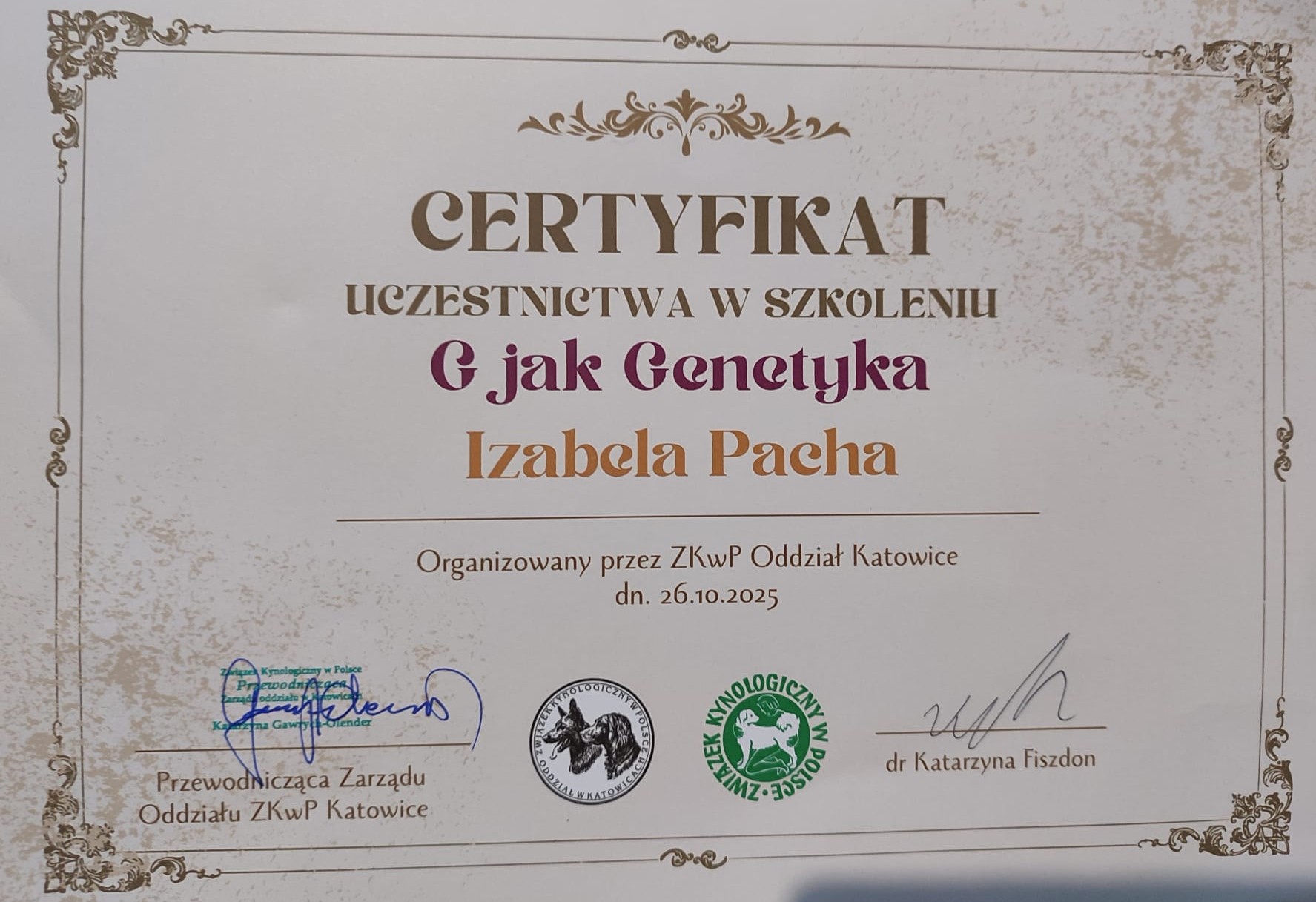 Szkolenia są nieodłącznym elementem prowadzenia hodowli. W każdej wolnej chwili korzystamy z możliwości poszerzania swojej wiedzy zarówno pod kątem trenerskim, behawioralnym, genetycznym, anatomiacznym aby świadomie podejmować decyzje związane z naszą hodowlą jak i być wsparciem dla właścicieli naszych szczeniąt.