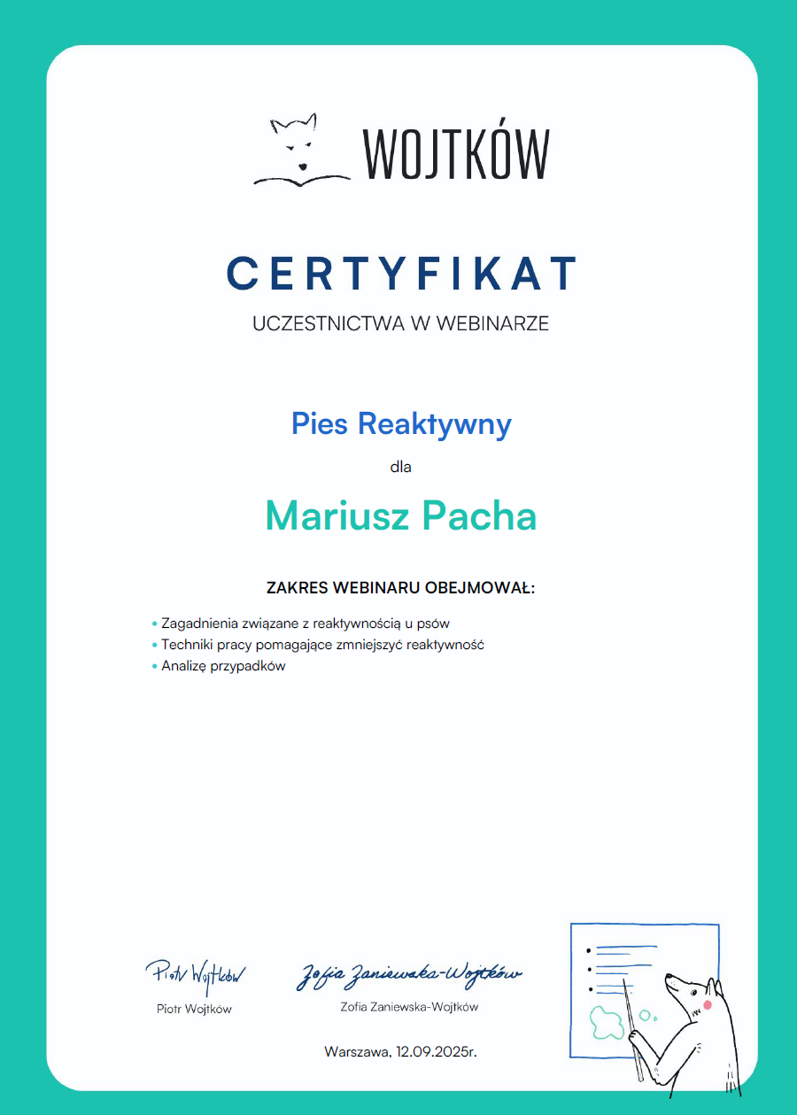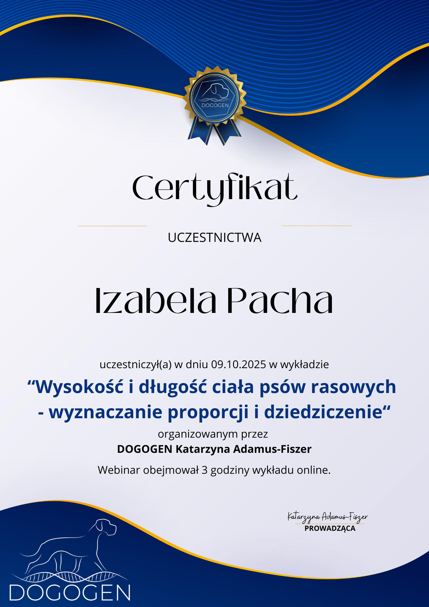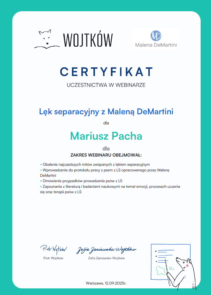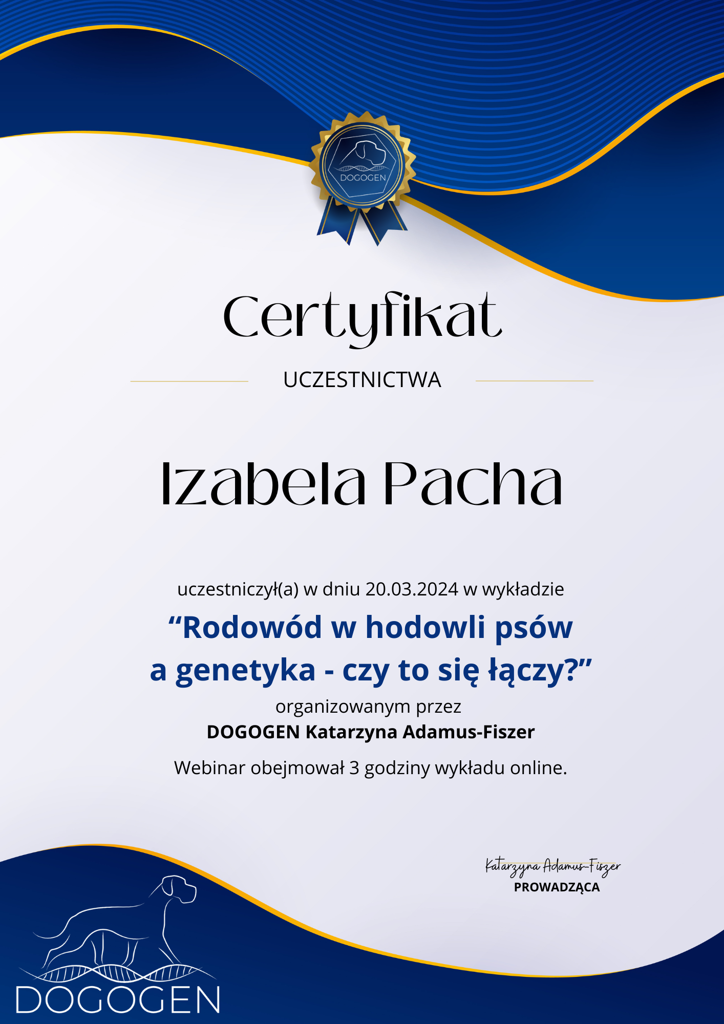 Szkolenia są nieodłącznym elementem prowadzenia hodowli. W każdej wolnej chwili korzystamy z możliwości poszerzania swojej wiedzy zarówno pod kątem trenerskim, behawioralnym, genetycznym, anatomiacznym aby świadomie podejmować decyzje związane z naszą hodowlą jak i być wsparciem dla właścicieli naszych szczeniąt.